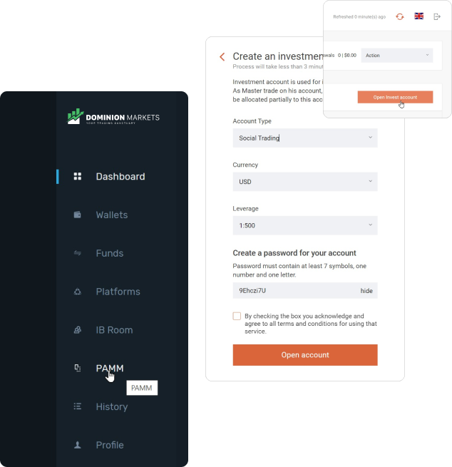 To open an account, make sure you are still on the PAMM dashboard and click on the button labelled